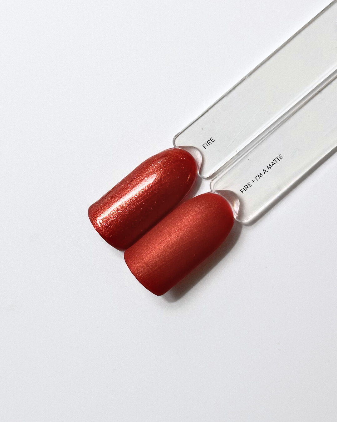 - Add any nail art or glitter if desired, cure, and then finish off with I'm A No-Wipe or I'm A Matte, making sure to cover the whole nail side wall to side wall and capping the free-edge. Cure for 60 seconds.